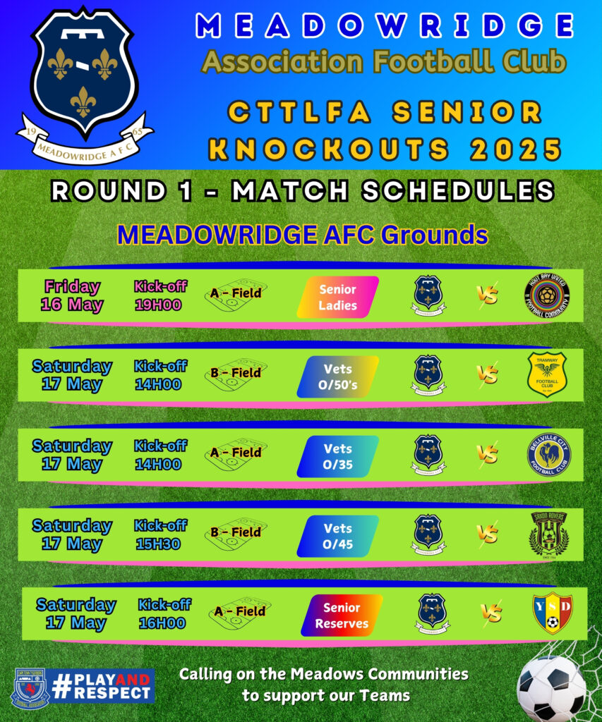UncategorizedMEADOWRIDGE AFC Weekend Preview | MATCH WEEK: 09 – 13 JULY 2025 Posted on 07 Jul 202509 Jul 2025 by Joe February 07 Jul#GoMeadows #GoMeadowsSA #MatchWeekMadness #ProudToSupport Continue reading →